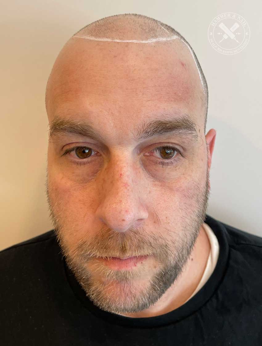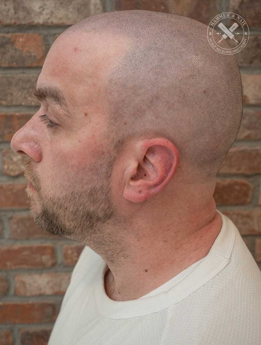 The pigment used for scalp micropigmentation is made from natural ingredients, including carbon, to ensure as much of a natural result as physically possible. Scalp micropigmentation is non-surgical and non-invasive, meaning it requires practically no downtime after sessions.