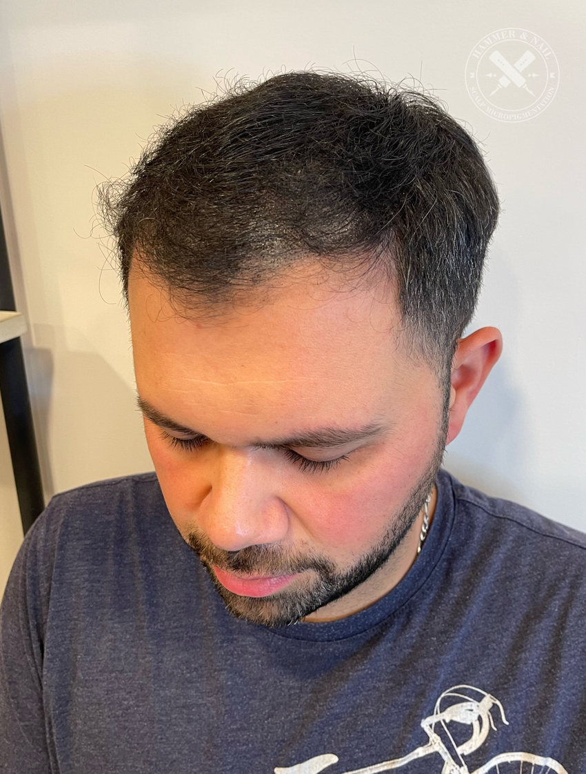 The pigment used for scalp micropigmentation is made from natural ingredients, including carbon, to ensure as much of a natural result as physically possible. Scalp micropigmentation is non-surgical and non-invasive, meaning it requires practically no downtime after sessions.