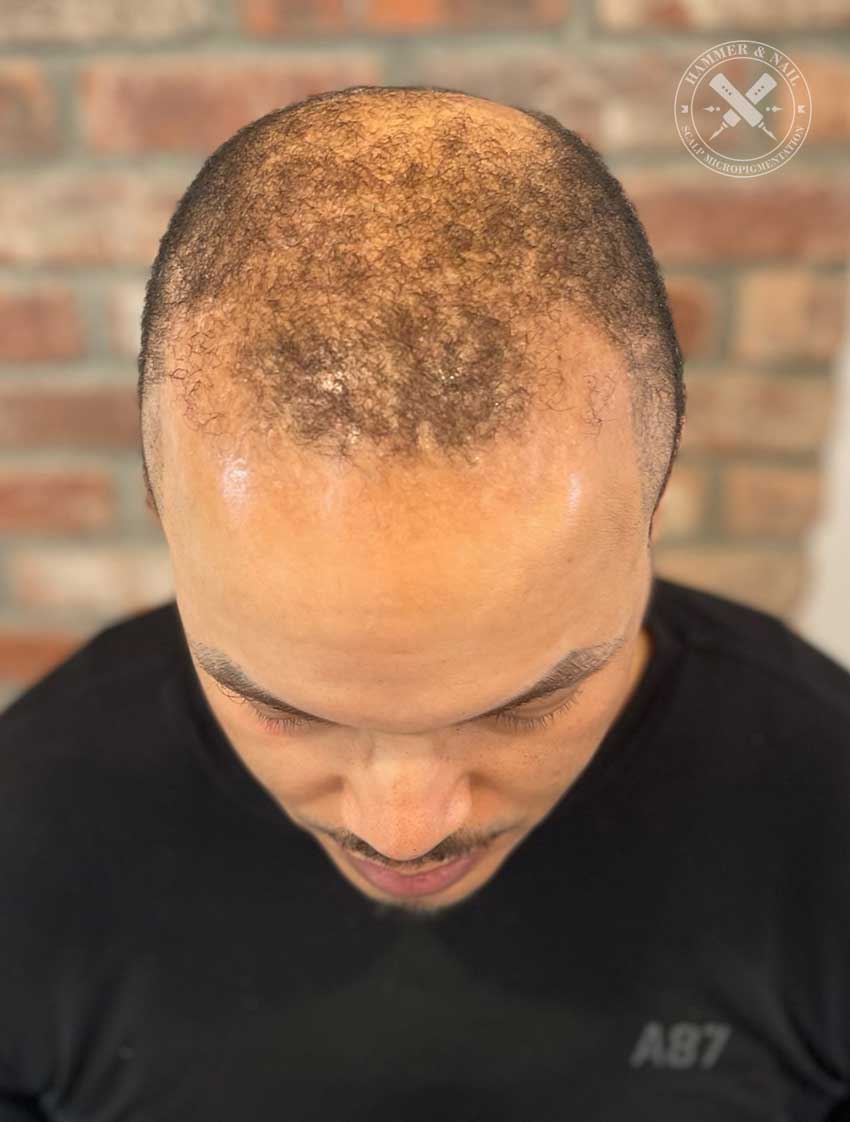 The pigment used for scalp micropigmentation is made from natural ingredients, including carbon, to ensure as much of a natural result as physically possible. Scalp micropigmentation is non-surgical and non-invasive, meaning it requires practically no downtime after sessions.